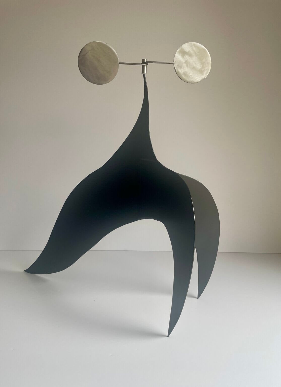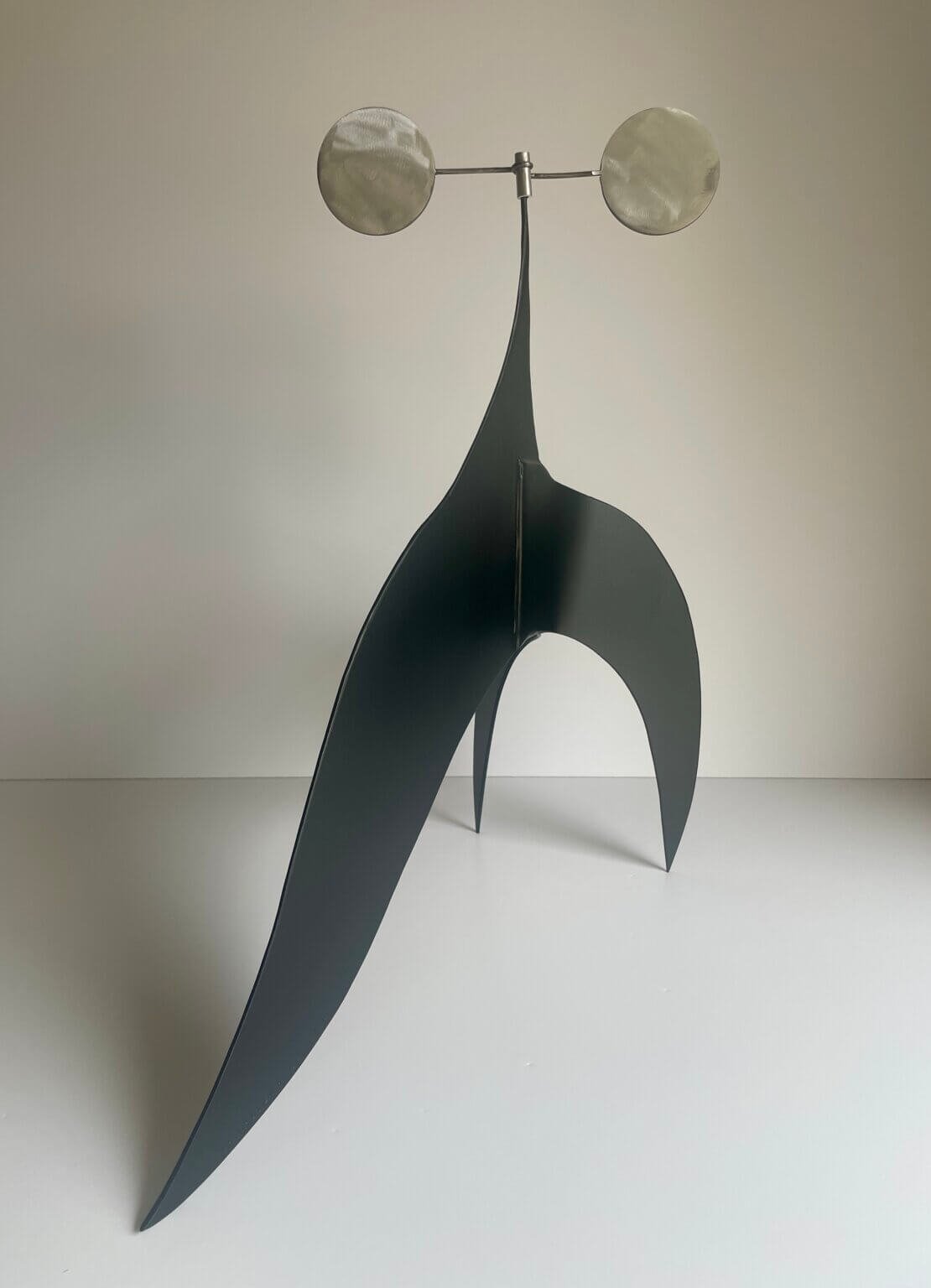 Shaped and welded steel, rod, wood, acrylic paint — kinetic (movement by touch)